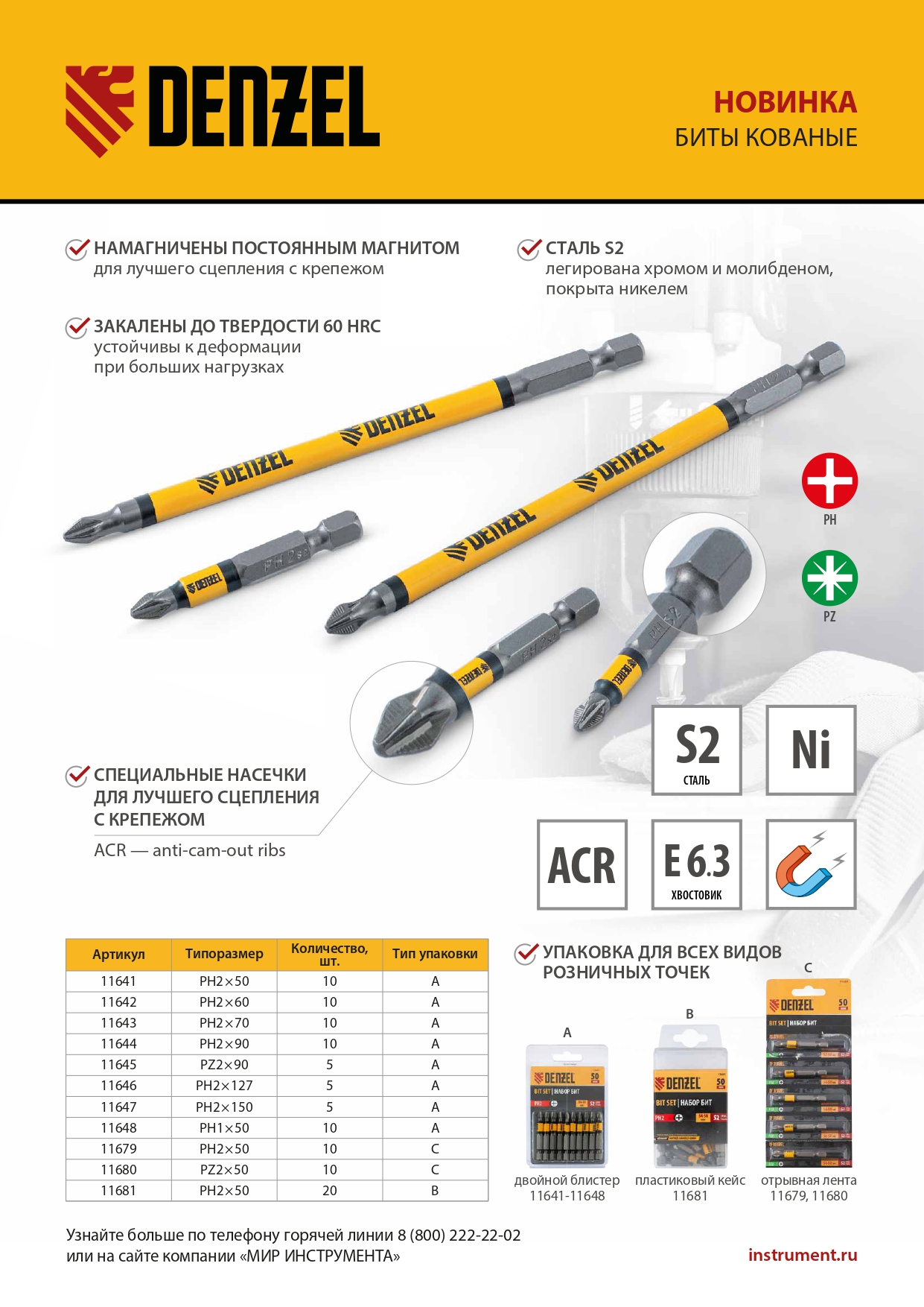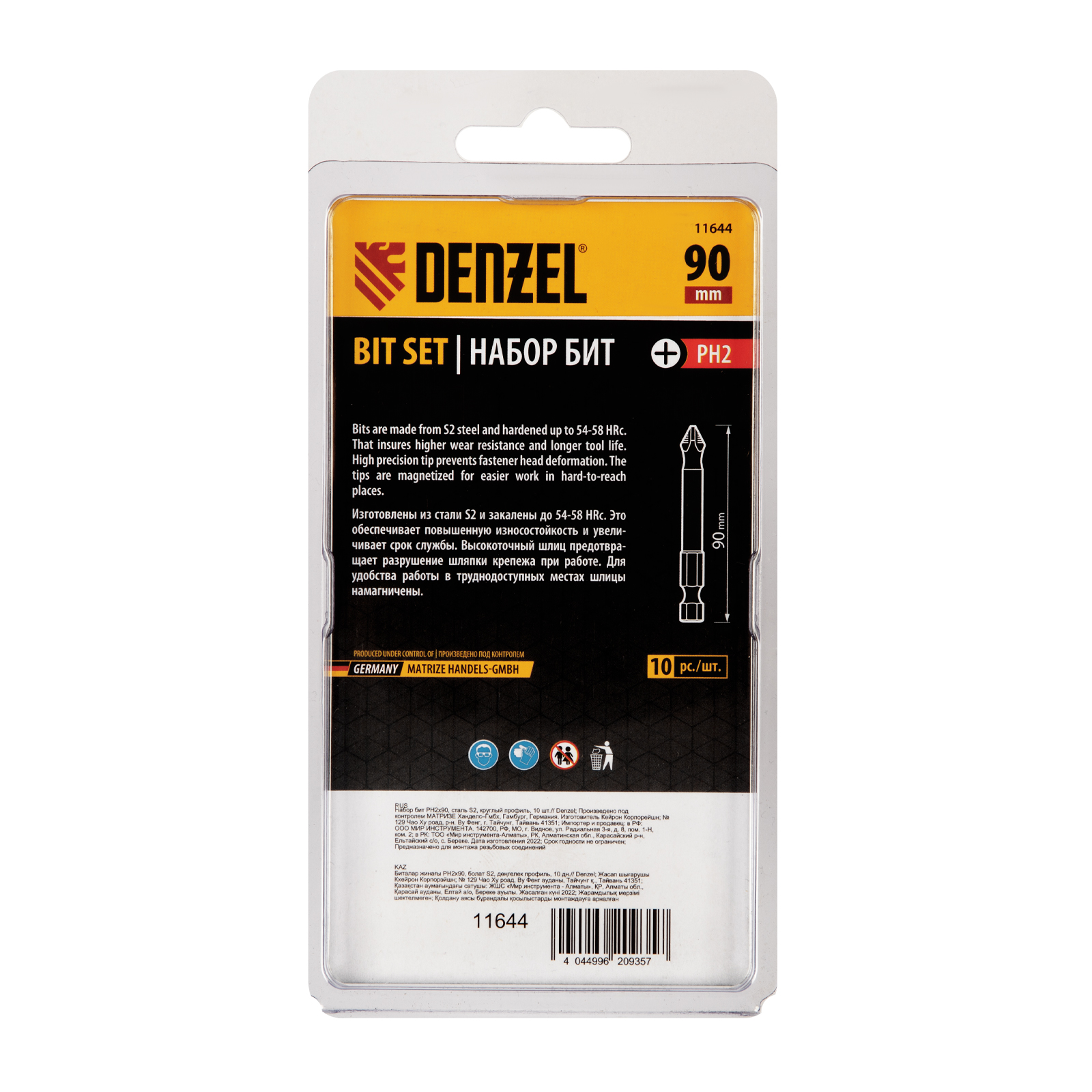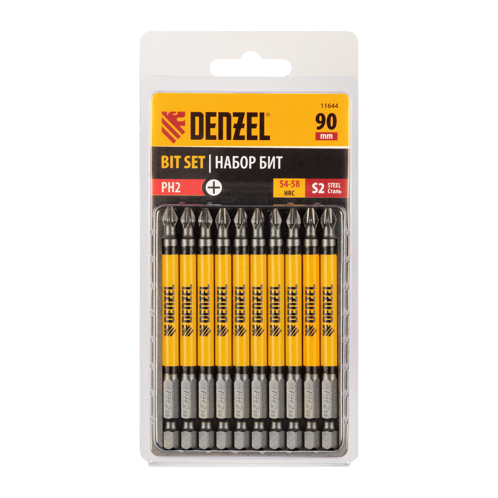 <p>Набор односторонних бит PH2 x 90 мм Denzel 11644 — это 10 сменных насадок из стали S2 с крестообразными шлицами и шестигранными хвостовиками 1/4". Профессиональная оснастка рассчитана на работу с шуруповертом, обеспечивает быстрый монтаж и демонтаж резьбовых соединений с углублением PH2.</p><h2>Преимущества</h2><ul><li>Долговечность — насечки на шлице препятствуют проскальзыванию и «слизыванию» бит, дополнительно усиливают контроль при работе с саморезами по дереву.</ul></li><ul><li>Высокая результативность даже в ограниченном пространстве — благодаря удлиненному до 90 мм профилю битами удобно работать в труднодоступных местах.</ul></li><ul><li>Устойчивость к деформации при больших нагрузках — биты изготовлены из японской легированной стали S2 повышенной прочности и закалены до твердости 58 HRC.</ul></li><ul><li>Намагниченный шлиц облегчает работу — крепеж удерживается битой, поэтому свободной рукой можно придерживать закрепляемую поверхность.</ul></li><ul><li>Антикоррозионные свойства — никелированное покрытие увеличивает срок службы насадок.</ul></li><ul><li>10 бит в комплекте — набора хватит на целую бригаду.</ul></li><ul><li>Удобная упаковка — оснастка поставляется в двойном блистере с европодвесом.</ul></li><h2>Характеристики</h2>Группа товаров: Ручной инструмент<br/>Длина, мм: 90<br/>Бренд: DENZEL<br/>Марка стали: легированная S2<br/>Размер посадки под оснастку, дюйм: 1/4<br/>Тип наконечника: PH2<br/>Тип хвостовика: шестигранный<br/>
