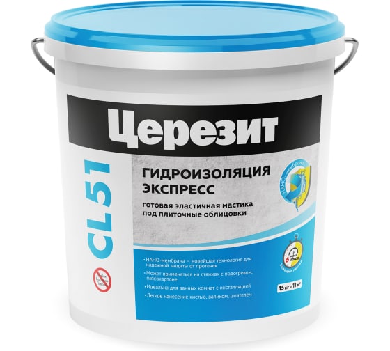 Гидроизоляция эластичная полимерная Церезит CL 51 15 кг 1/44 23142 2572047 - однокомпонентная полимерная масса, применяемаядля создания эластичных водонепроницаемых покрытий перед устройством плиточных облицовок в помещениях, подверженных периодическому увлажнению (ванных, душевых, туалетах, кухнях и т. д.). Готова к применению. Подходит только для внутренних работ. Не содержит растворителей.
