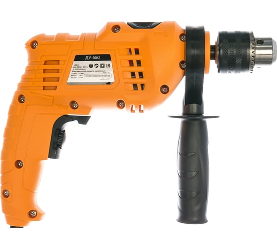 Модель электродрели Вихрь ДУ-550 оснащена реверсом, что обеспечивает вращение по и против часовой стрелке для закручивания и откручивания метизов, также помогает изъять застрявшее сверло без его повреждения. Диаметр патрона 1,5-13 мм позволяет выбирать сверла различного диаметра. Максимальный диаметр сверления стали - 10 мм, бетона - 13 мм, дерево - 25 мм.
