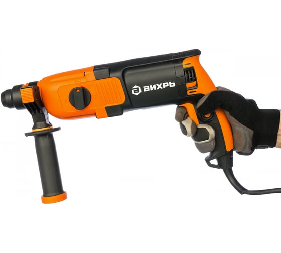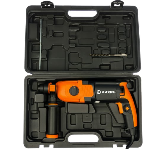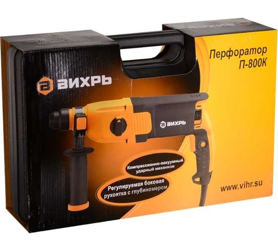 Для повышения эффективности и простоты эксплуатации в модели Вихрь П-800К имеется системы настройки углового положения и регулирования частоты вращения от 0 до 1100 об/мин, а также патрон для быстрой замены рабочей оснастки, реверс и специальная муфта для отключения перфоратора при его заклинивании. Есть также блокировка кнопки пуска, что облегчает работу с инструментом во время длительных сессий. Перфоратор рассчитан на сверление бетона, стали, дерева с максимальным диаметром 28, 13, 40 мм соответственно и снабжён регулируемым ограничителем глубины сверления. Инструмент питается от сети 200 В, 50 Гц. Вес – 2.7 кг. Для хранения и переноски предусмотрен удобный кейс.