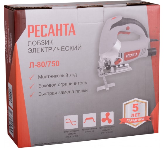 В модели Ресанта Л-80/750 интегрирована производительная функция маятникового хода и предусмотрено регулирование частоты хода штока в пределах 500-3000 ход/мин. Имеется возможность регулирования угла наклона подошвы, что значительно расширяет возможности электрического лобзика. Для удаления с места пиления опилок имеется возможность подсоединения к лобзику пылесоса. В комплектацию вместе с инструментом входят параллельный упор, специальное пильное полотно и ключ-шестигранник. Для подключения инструмента к сети предусмотрен кабель длиной 2 м. Параметры электросети – 220 В, 50 Гц.