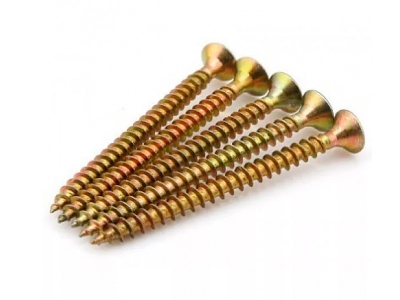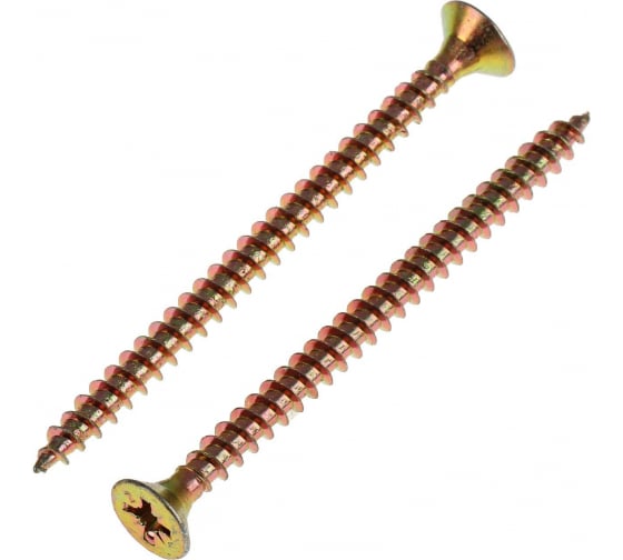 Универсальный саморез 70х5,0 мм желтый, изготовлен из углеродистой стали с антикоррозионным цинковым покрытием, имеет потайную головку с крестообразным шлицем PZ, крупную накатанную резьбу и острый наконечник.