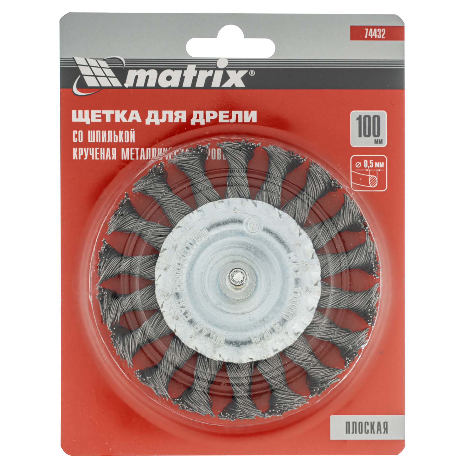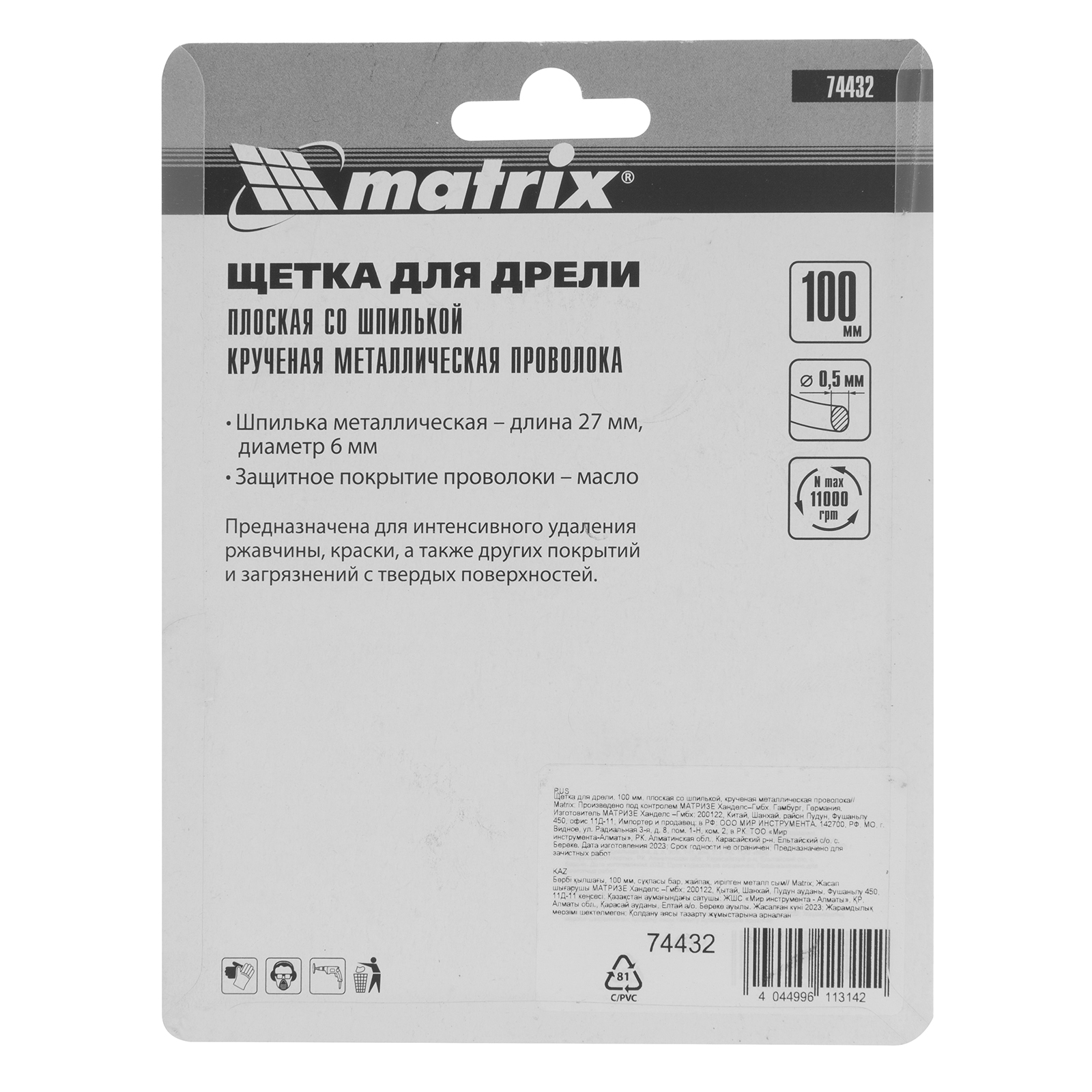 <p>Плоская щетка со шпилькой для дрели Matrix 74432 диаметром 100 мм, с крученой металлической проволокой, позволяет быстро очистить металлическую, деревянную или бетонную поверхность от загрязнений, ржавчины, старой краски или лака. Используется для обработки внутренних углов, пазов, изгибов, узких и труднодоступных мест. Подходит для очистки сварных швов. При помощи хвостовика диаметром 6 мм щетку устанавливают в патрон дрели или ПШМ с максимальной частотой вращения до 11000 об/мин. Насадка применяется в строительстве, машиностроении, пригодится также в быту. Во время работы со щеткой следует использовать средства индивидуальной защиты.</p><h2>Преимущества</h2><ul><li>Щетина из крученой проволоки диаметром 0,5 мм успешно справляется с толстым слоем ржавчины или лакокрасочного покрытия.</li></ul><ul><li>Для изготовления щетины использована высококачественная проволока из прочной стали, что обеспечивает долговечность оснастки.</li></ul><ul><li>Цинковое покрытие корпуса и масляная пленка на щетине обеспечивают защиту щетки от коррозии.</li></ul><ul><li>Оснастка произведена на крупном заводе с постоянным контролем качества, что гарантирует ее надежность.</li></ul><h2>Характеристики</h2>Группа товаров: Ручной инструмент<br/>Бренд: MATRIX<br/>Диаметр внешний, мм: 100<br/>Материал: сталь<br/>Тип обработки: зачистка<br/>