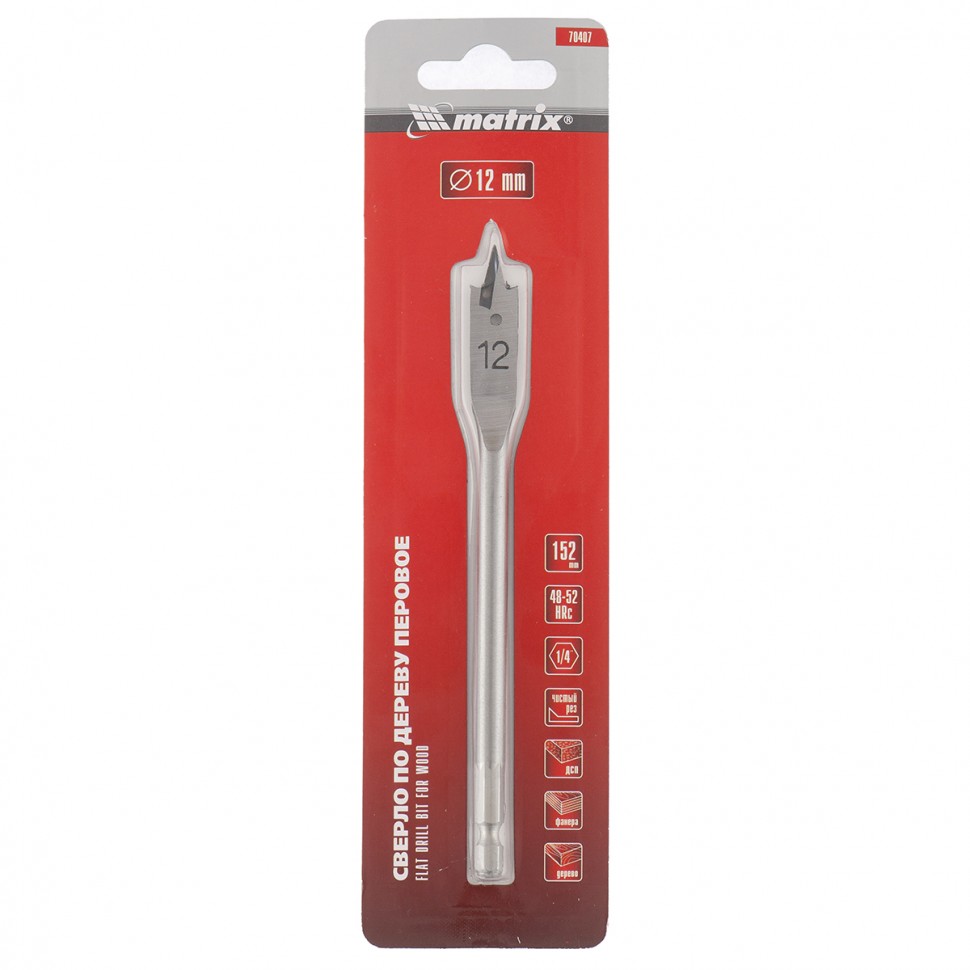 <p>Перовое сверло по дереву Matrix 70407 диаметром 12 мм, с 6-гранным хвостовиком, имеет рабочую часть в виде «лопатки» с режущими кромками по бокам, поэтому эффективно для сверления глубоких сквозных и глухих отверстий. Устанавливается на ручную механическую, электрическую дрель или шуруповерт, эффективно для сверления древесины любых пород.</p><h2>Преимущества</h2><ul><li>Прочность и износостойкость — сверло выполнено из стали 45, режущие кромки закалены до твердости 48-52 HRC.</li></ul><ul><li>Высокое качество проводимых работ — благодаря подрезателям на режущей части края отверстий получаются ровными.</li></ul><ul><li>Возможность увеличить глубину сверления — оснастка совместима с удлинителем Matrix 70495.</li></ul><ul><li>Комфортная работа — шестигранный хвостовик не проворачивается в патроне дрели или шуруповерта.</li></ul><h2>Характеристики</h2>Группа товаров: Ручной инструмент<br/>Длина, мм: 152<br/>Бренд: MATRIX<br/>Диаметр, мм: 12<br/>Марка стали: 45<br/>Материал обработки: дерево<br/>Рабочая длина, мм: 152<br/>Тип хвостовика: шестигранный<br/>
