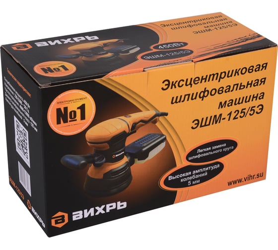 Эксцентриковая шлифовальная машина бытового назначения Вихрь ЭШМ-125/5Э имеет мощность 450 Вт. Предназначена для обработки изделий из древесины, металла, пластмассы. Щеточный тип мотора отличается высокой производительностью. Диаметр диска для шлифовки 125 мм позволяет использовать абразивные круги стандартного размера. Скорость диска от 4000 до 13000 об/мин дает возможность регулировать особенности режима для обработки различных по плотности поверхностей. Колебательная амплитуда рабочей поверхности достигает 5 мм, что позволяет осуществлять грубую шлифовку, в том числе для устранения значительных неровностей и коррозии. Возможно использование шлифовальных насадок любого уровня зернистости.